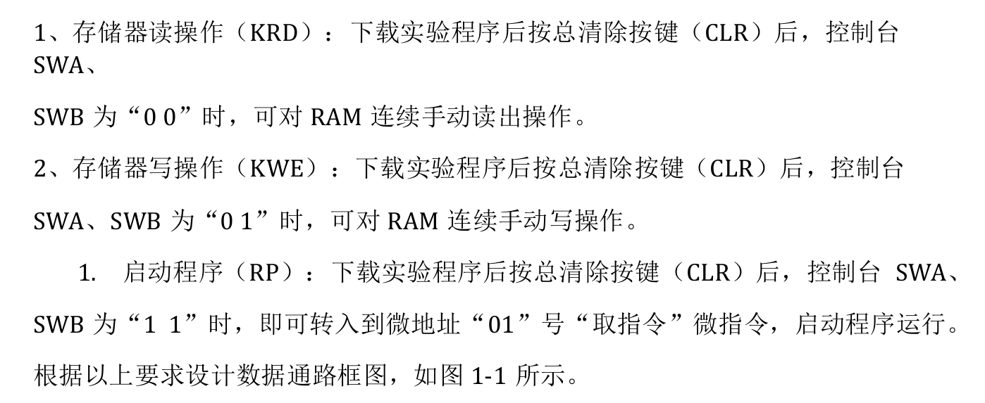 接下来你要懂怎么操作实验箱,实验箱下面有很多个按钮,首先你得把左边有个LED的那个调成0(实验模式),要不然你根本弄不了。然后最左边的按钮是RST(键8),如果它开着就一直重置环境,所以要重置得先开再关,然后把3和4按钮打开,3和4按钮分别是SWA和SWB,因为原装程序是有控制台微指令的,这个很臃肿,是为了让你手动一个一个输入RAM,我们在之后的设计中需要把它去掉,因为我们刷入的话是不需要手动的。SWA和SWB设置为11代表启动程序。(注:原装程序和讲义上的一样,看讲义就行),对于microcode,讲义有很多错误,请自行理解.jpg。