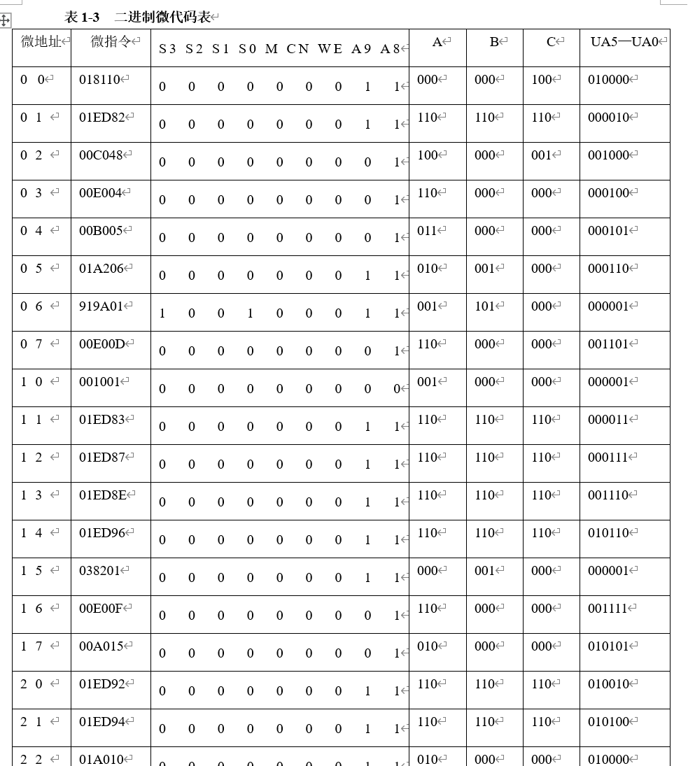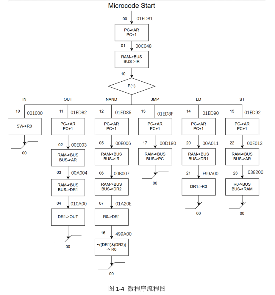 我强烈建议和原装程序一样,你要搞不懂P(1)的原理,你就这么理解,P(1)是指令的属性(C字段),在01(我设计的微指令树)指令的C字段有一个P(1)属性,那么它跳转的地址将会是IR里的数值的高位值+跳转地址,而且强烈建议你把第一个指令地址编在10,后面接着11,12.....,这样也方便我们进行调试。然后记得把微指令编满一点,显得你很懂,比如说01之后的02可以编到第一个指令的下面的节点啥的,可以跳着编,这几个指令的顺序也能换。编完地址后把微指令写到一个表里面,用python来转换成16进制,不要自己瞎转,错了的话调试几个小时。