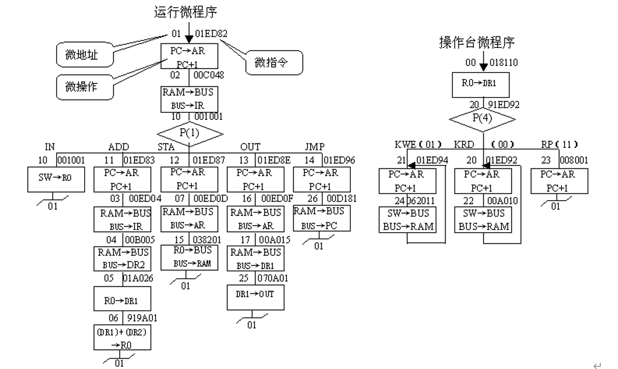 这两个图很重要,我们先讲解ROM,不要把微指令和RAM中的汇编搞混,你可以理解为两套系统,微指令从00微地址开始,MC会显示当前微指令的代码,验收的时候也是看这个走哪条流程的。所以按照上面的图,微指令会先从操作台微程序开始,然后走一个P(4)的选择结构,这个选择结构会按照SWA和SWB的开关选择一个分支,如果是11(也就是正常执行程序),则会跳到运行微程序的地方,所以这就是我说的我们的课程设计完全可以去掉操作台微程序的原因。